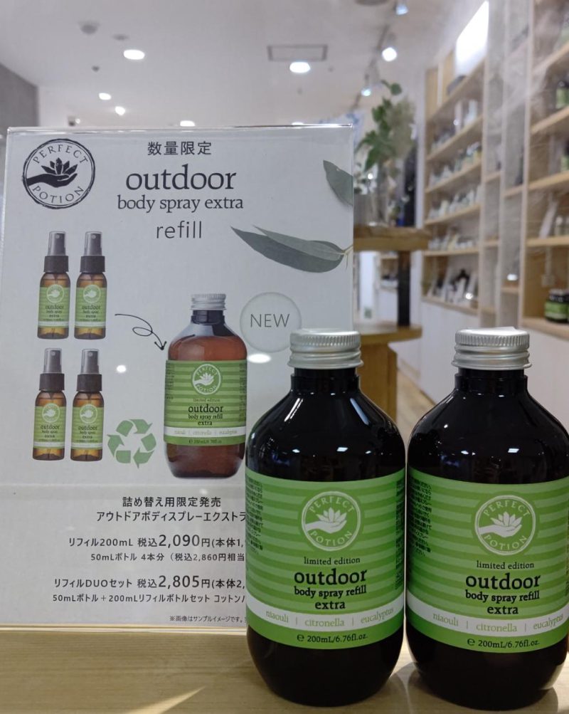 パーフェクトポーションの夏の定番のアイテム、アウトドアボディスプレーExtraに詰め替え用リフィル200mlが数量限定で発売しました!