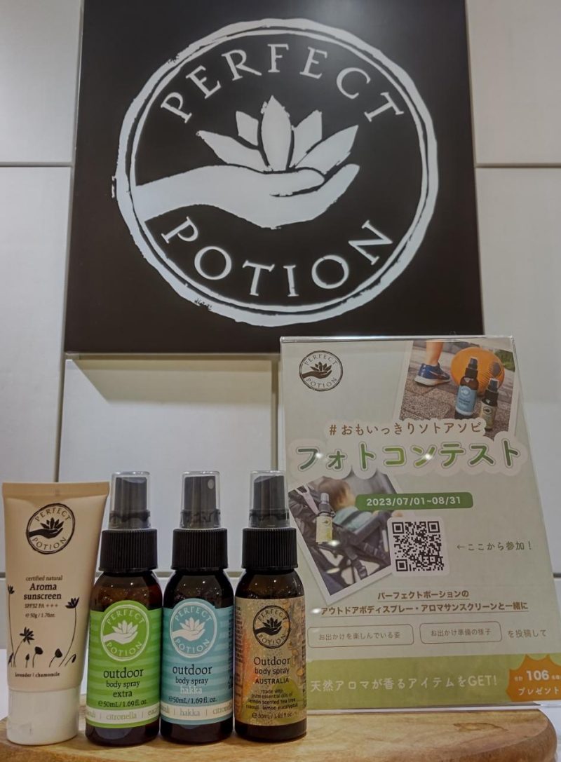 パーフェクトポーションのアウトドアボディースプレー、アロマサンスクリーンと一緒に写して投稿してください。