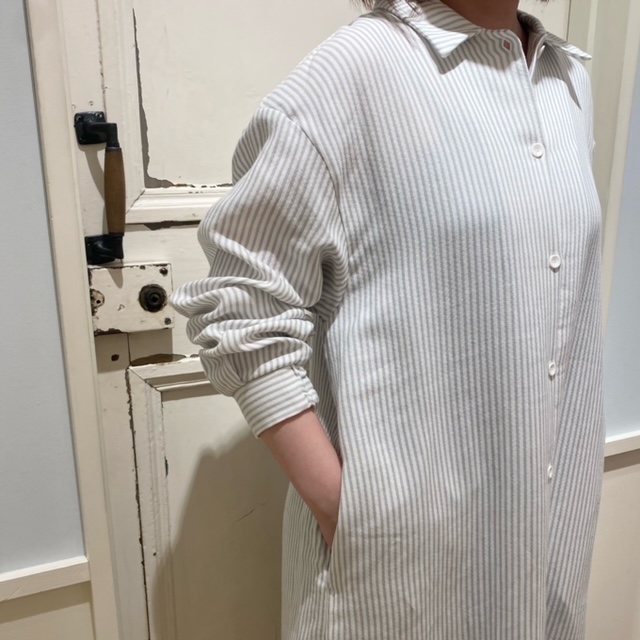 後ろ裾をちょっと長めに作ったゆったりシルエットのロング丈で、袖はロールUP仕様に。