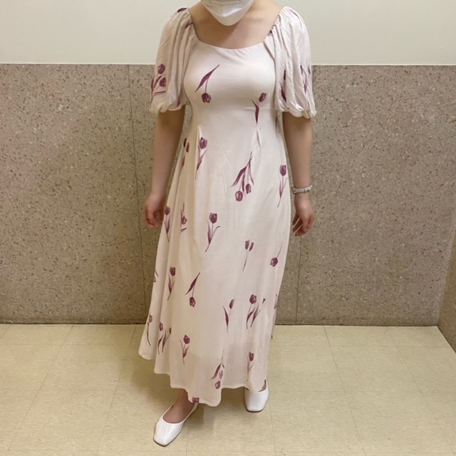 胸元をたっぷり開けたショート丈と、チューリップのようにぷくっと膨らんだ袖が女性らしいシルエットを強調します。