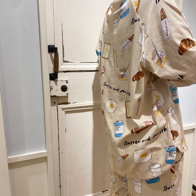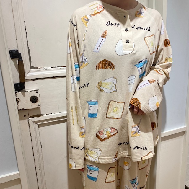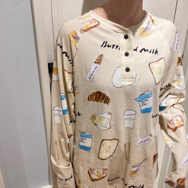 美味しそうなパンやミルクなど、幸せな朝を思わせるイラストをプリントしたヘンリーネックに