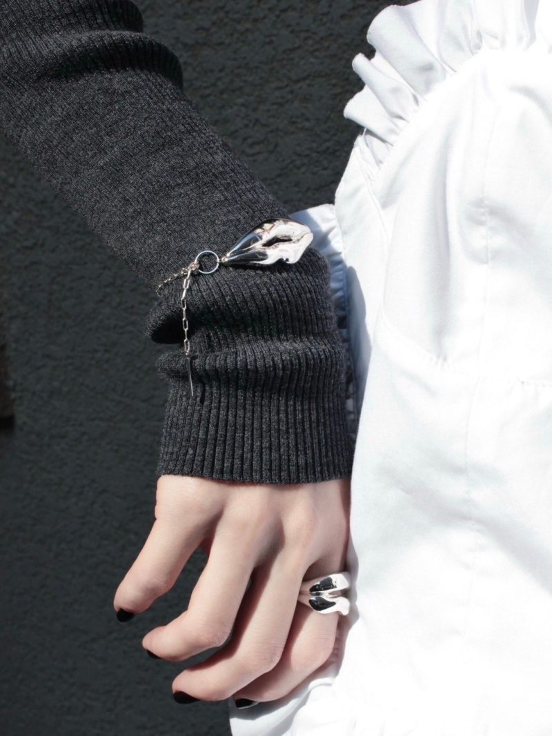 ジュエリーによって、洋服という普遍的な物に驚きと輝きをもたらせたらと願い製作しております。
