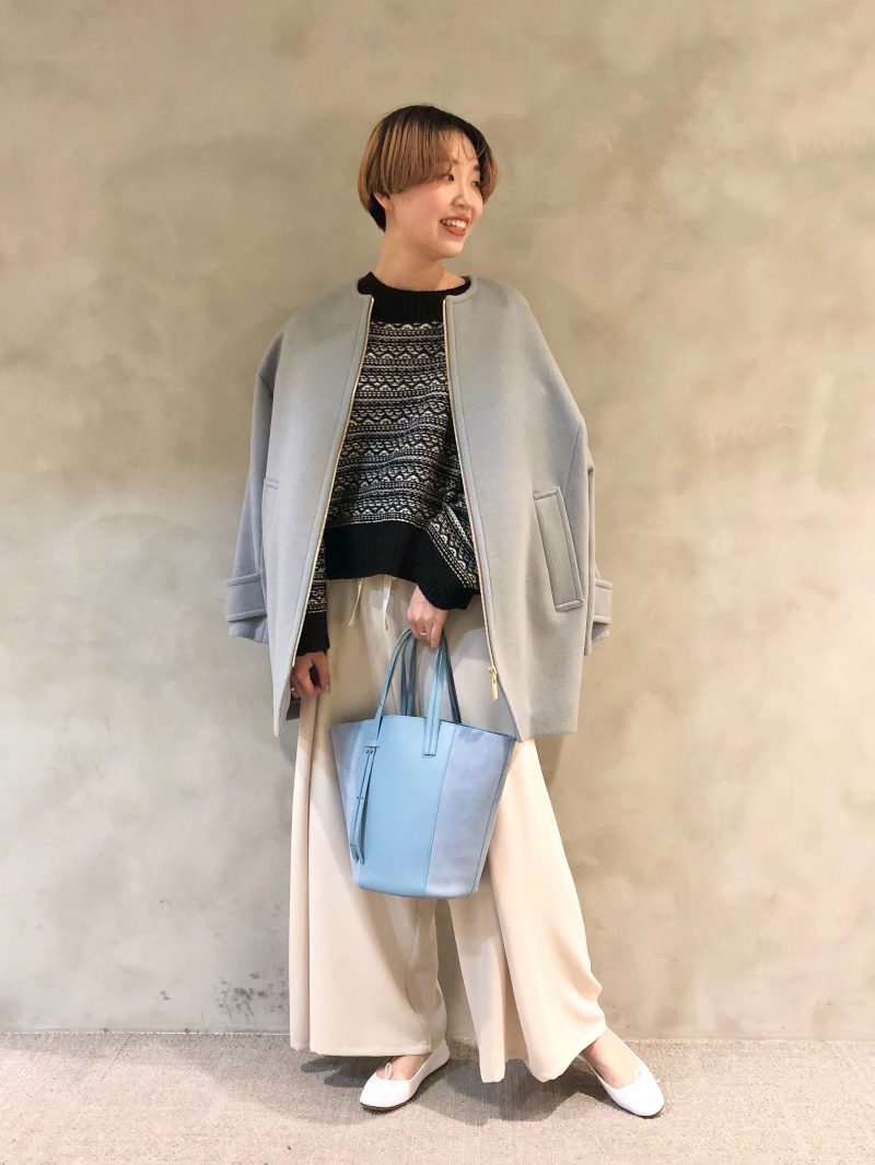 ベージュ×シャーベットブルーで女性らしい印象に!全体的に柔らかいカラーなので足元はブラックのブーツで今年っぽくまとめました♪