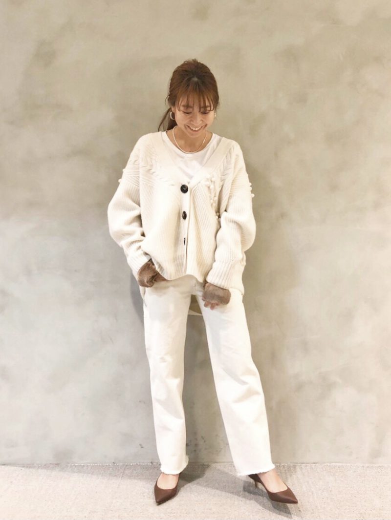 普段フェミニンな着こなしな苦手な方でも、この時期ならではの女性らしい華やかな着こなしを!!ホワイトのパンツで甘くなりすぎないようにバランスをとるのがポイントですよ♪