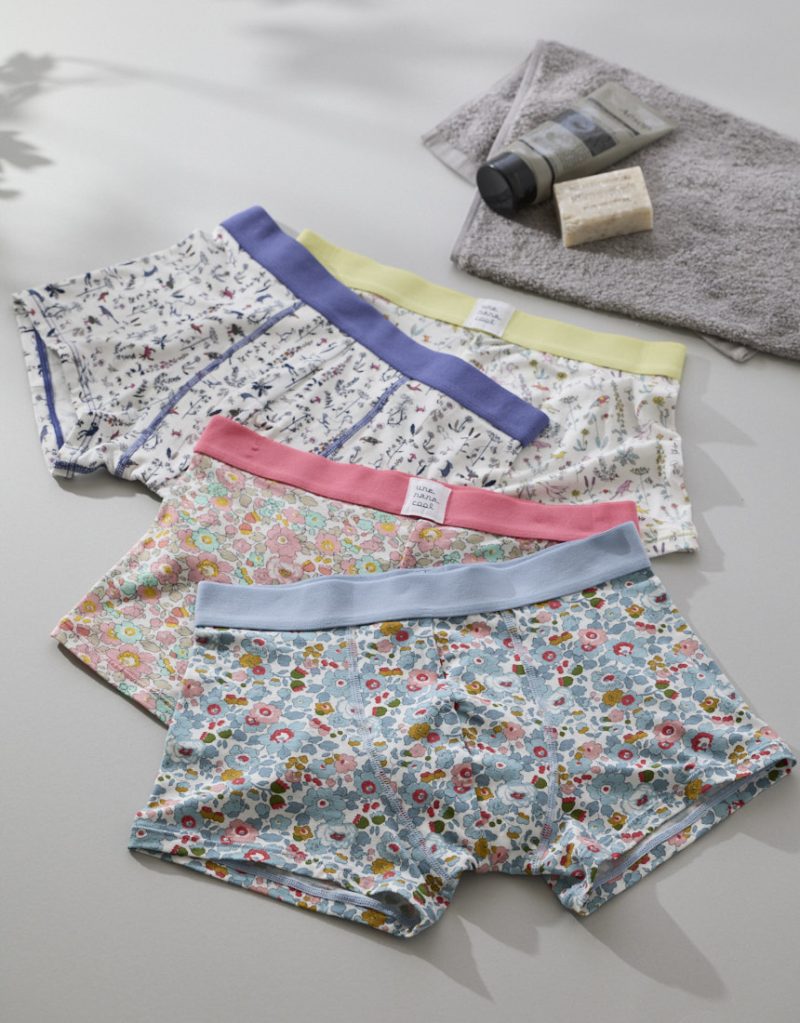 LIBERTY柄のSX、PIカラーは「Betsy」柄、BU、CRカラーは「Theo」柄をプリントしたメンズボクサーパンツ。