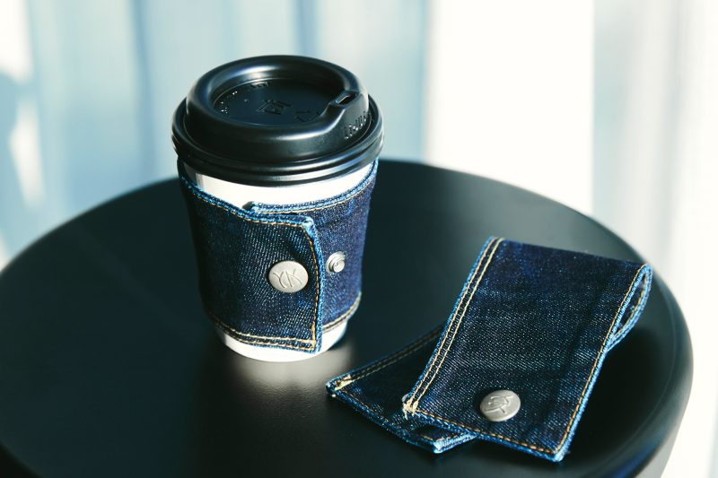 YANUKのデニム生地で作られたコーヒースリーブをお渡しします。