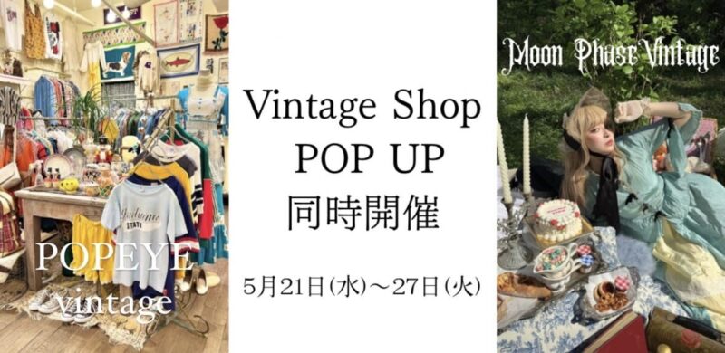 1950〜90s幅広い年代のアイテムを取り扱うレディース古着屋【POPEYE vintage】と1950〜70年代のアメリカヴィンテージを中心に、ヴィクトリアンアンティークから現代のレギュラー古着まで取り扱う【Moon Phase Vintage】の合同POP UP STOREを藤井大丸 3階ポップアップスペースにて開催。