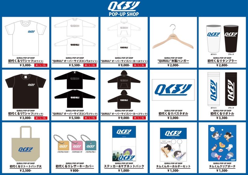 メインビジュアルを手がけたのはイラストレーターのdokkoi氏。ポップアップでは新たに制作したグッズが販売となり、初代くるりロゴデザインのTシャツ、トートバック、バスタオル、マグネット&ステッカーセット、レザーキーカバーなどの小物に加えて、QURULIロゴのロンT、パーカー、ハンガー、更に昨年に引き続きタムくんがデザインをしたキーホルダー、ポーチなど、多種多様なグッズが盛りだくさんラインナップされます。その他にも「くるりのえいが」場面写真のパネルや、ツアーで着用した衣装も展示します。