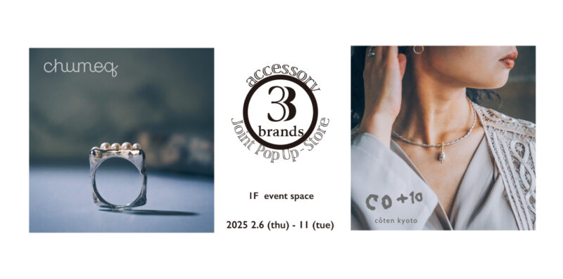 今回はchumeq(チュメック)・co+10(コウテン)・Toi(トワ)の3つのアクセサリー・ジュエリーのブランドが集まったpop up storeとなります。