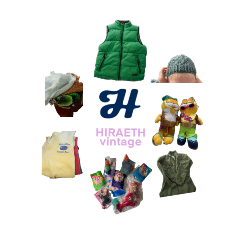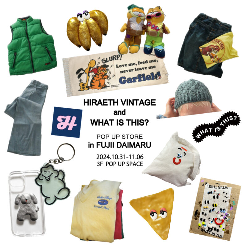 「HIRAETH」vest ¥8,900、knitcap ¥4,800、toy ¥5,200、militarycover all ¥9,800、toy ¥1,600、sweat ¥8,800〜、vintage scarf ¥3,900