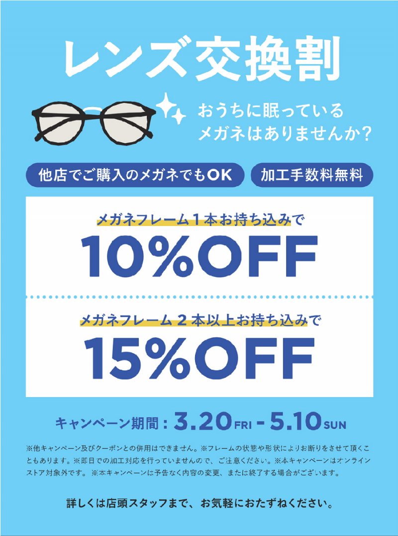 お持ちの眼鏡フレームを1本お持ち込みで10%OFF、2本以上のお持ち込みで15%OFFさせていただきます。