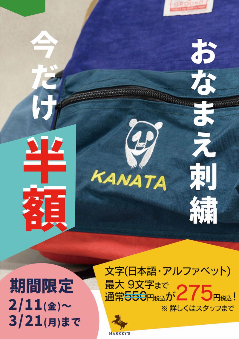 期間中、対象商品に名前(文字)を刺繍いただくと通常、刺繡1点につき550円(税込)のところ、半額の275円(税込)で刺繡いたします。